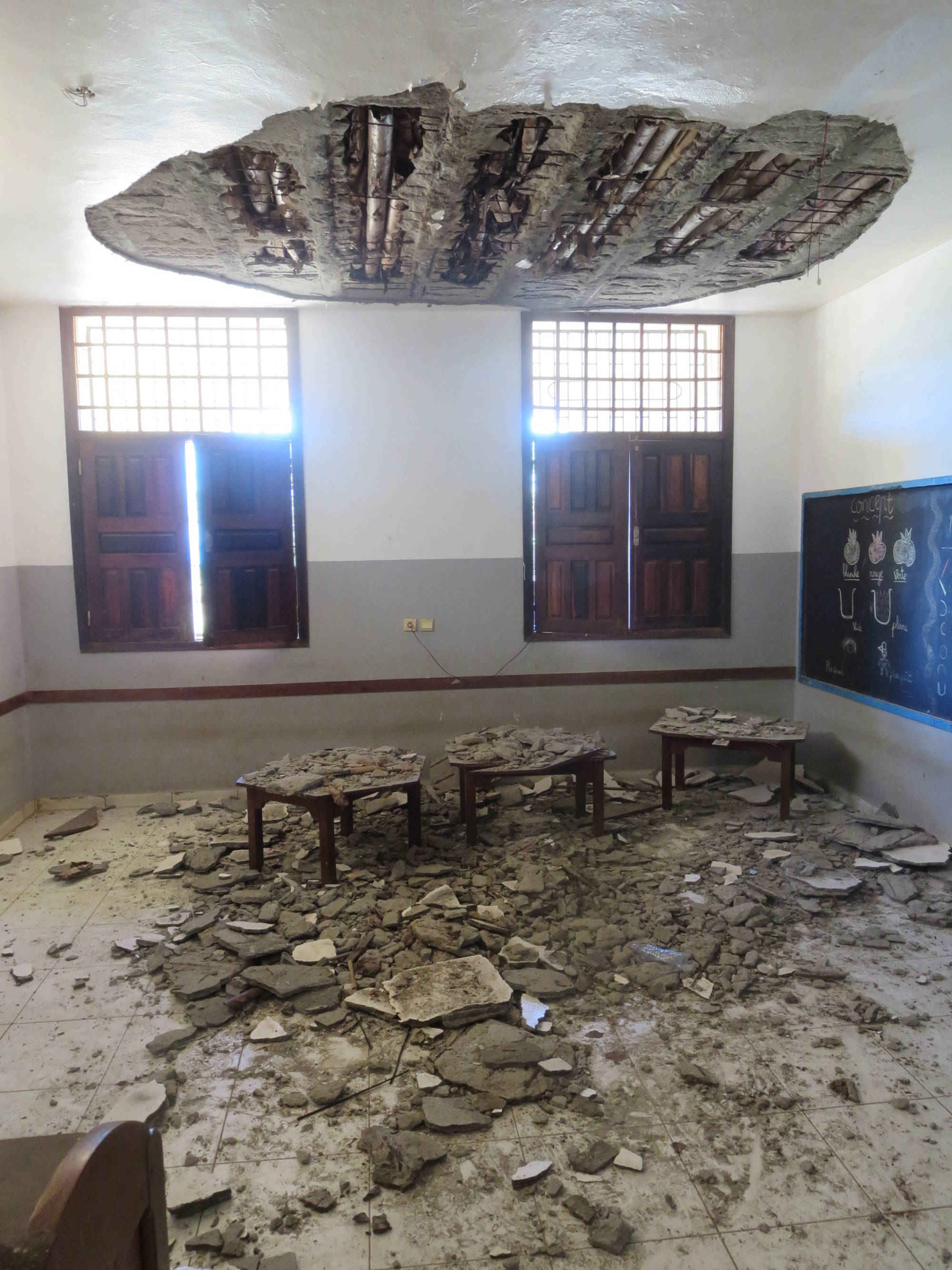 Lo scorso Aprile 2017 a causa di una trascurata infiltrazione d’acqua, di notte si è verificato il crollo di una porzione di soffitto di una delle aule della scuola materna della Missione di Santa Theresa.